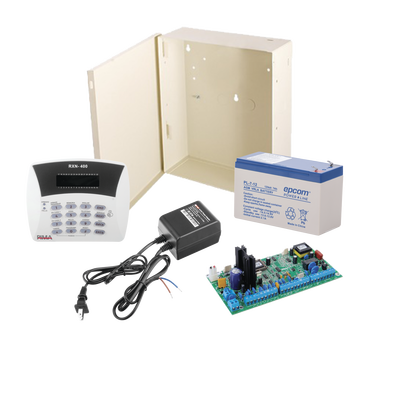 Kit de Alarma Hunter8 para uso de Transmisor Radio incluye Panel de Alarma, Teclado, Gabinete, Batería de 7Ah y Transformador.