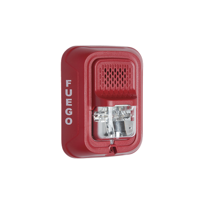Sirena con Lámpara Estroboscópica a 2 Hilos, Montaje en Pared, Color Rojo, Configuración Estroboscópica Seleccionable y Texto en Español, Nuevo Diseño Moderno y Elegante y Menor Consumo de Corriente