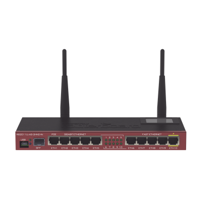 Router Board, 10 Puertos Ethernet, 1 Puerto SFP, Wi-Fi de Gran Cobertura 2.4 GHz Antenas de 4 dBi, hasta 1 Watt de potencia