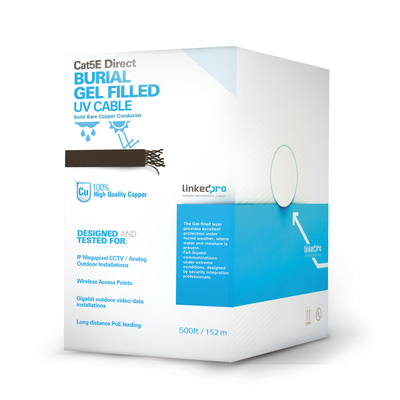 Bobina de cable de 152 m ( 500 ft) Cat5E exterior con gel, doble forro, extrema humedad, bajo tierra, UL, color negro para aplicaciones en CCTV, y redes de alta velocidad. Uso en intemperie