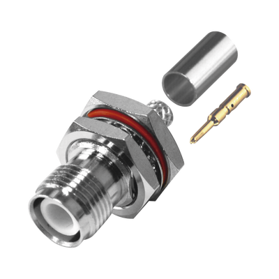 Conector TNC Hembra Inverso de Montaje Trasero en Panel, D-Plano, Hermético de Anillo Plegable para RG-142/U, Níquel/ Oro/ Teflón.
