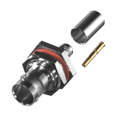 Conector BNC Hembra para Chasis en D-Plano con Aro de Goma, Anillo Plegable para RG-59/U, Grupo D, 75 Ohm, Níquel/ Oro/ Delrin cantidad