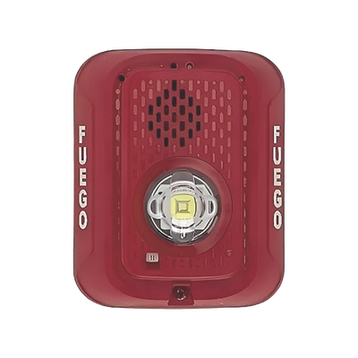 Sirena con Lámpara Estroboscópica LED / 2 Hilos / Montaje en Pared / 15 a 185 Candelas / Temporal 3 Alto y Bajo / Tamper Integrado / Texto en Español / Color Rojo