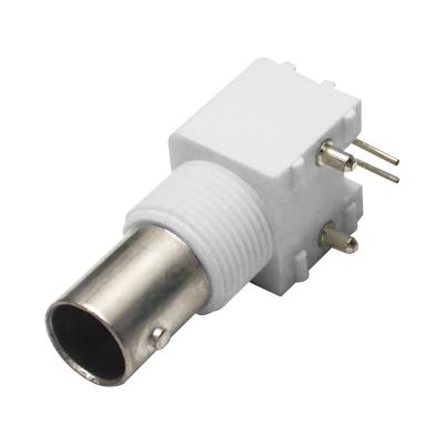 Conector BNC Hembra en Ángulo Recto para PCB, Postes y Patas, Cuerpo Termoplástico Blanco, Níquel/ Oro/ Polipropileno.